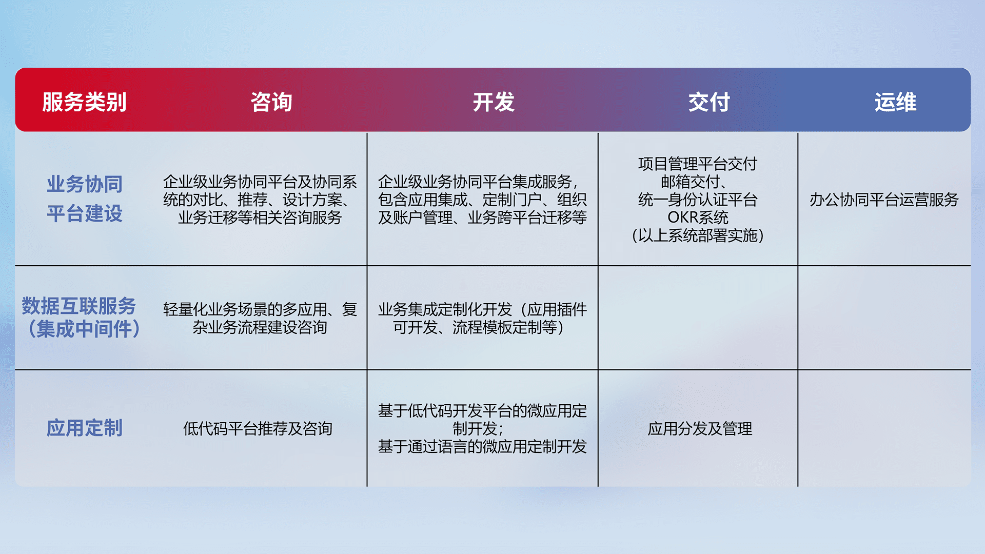 针对钉钉、、、、企微、、IDaas等平台级产品提供产品的规划、、方案、、、交付、、定制化开发等服务,,,实现如统一协同办公、、、、智能客户服务、、、混合会议管理、、智能数据查询、、、等业务场景,,,,实现数字化转型。。。。